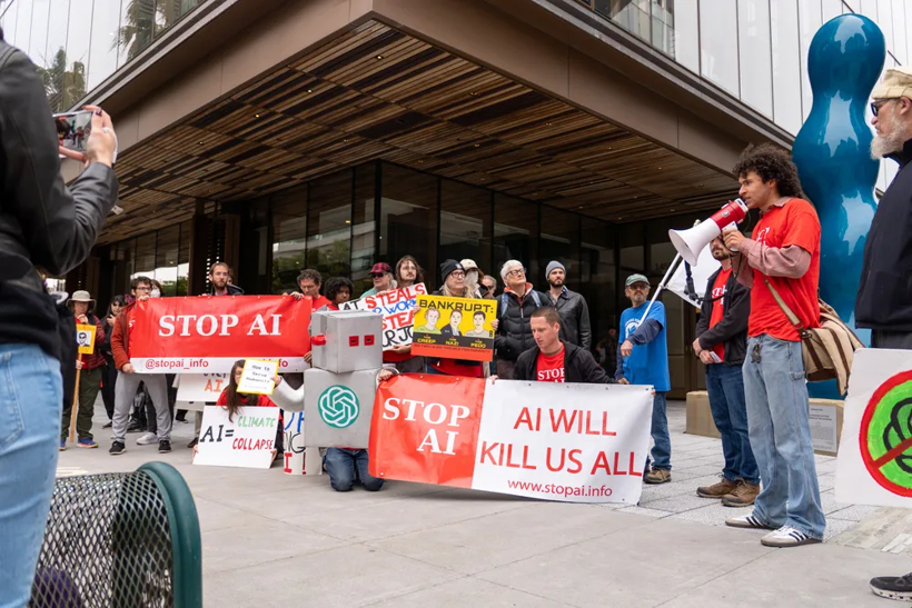 Temmuz 2025’te Open AI’nın San Francisco genel merkezinin önünde düzenlenen bir protesto sırasında konuşan Stop AI üyeleri.